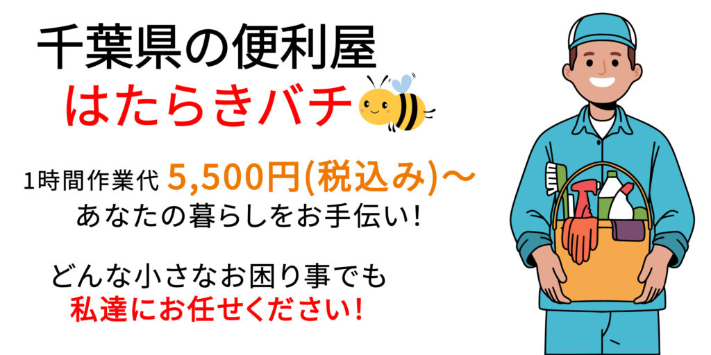 そんな時こそ、千葉の便利屋『はたらきバチ』にお任せください!不用品回収から草刈り、ハウスクリーニング、家具の移動など、どんな小さな困りごとでも、あなたの代わりにすべて解決します。頼みやすい価格、親しみやすい対応で安心してご利用いただけます。
