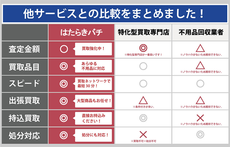 正直なところ、特定ジャンルに特化した専門買取業者(例:家具専門・音響機器専門など)に比べると、買取価格で劣る場合があるのも事実です。しかしその分、買取対象品目の幅広さ、対応スピード、柔軟なサービス内容でご満足いただける体制を整えております。